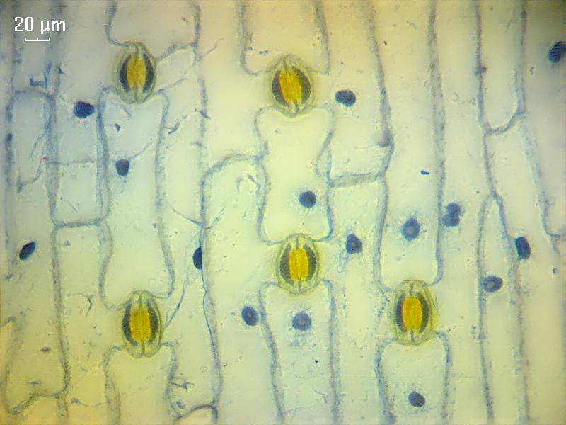 Для примера сделал эпидерму листа тюльпана (с весны плавала в фиксаторе). Окрасил хризоидином и водным синим, после "по быстрому" провел через 2 смены изопропанола и 2 смены ксилола (надо бы минимум по 3 смены) и заключил. Канифоль, конечно, желтит препарат (желтый цвет в устьицах - это хризоидин, а общий фон - это от канифоли)