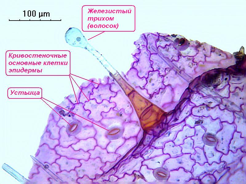 Эпидерма листа герани. В центре фото железистый трихом (не от слова "желЕзо", а от слова "железА"). Окраска толуидиновым синим и хризоидином. Объектив 20х.
