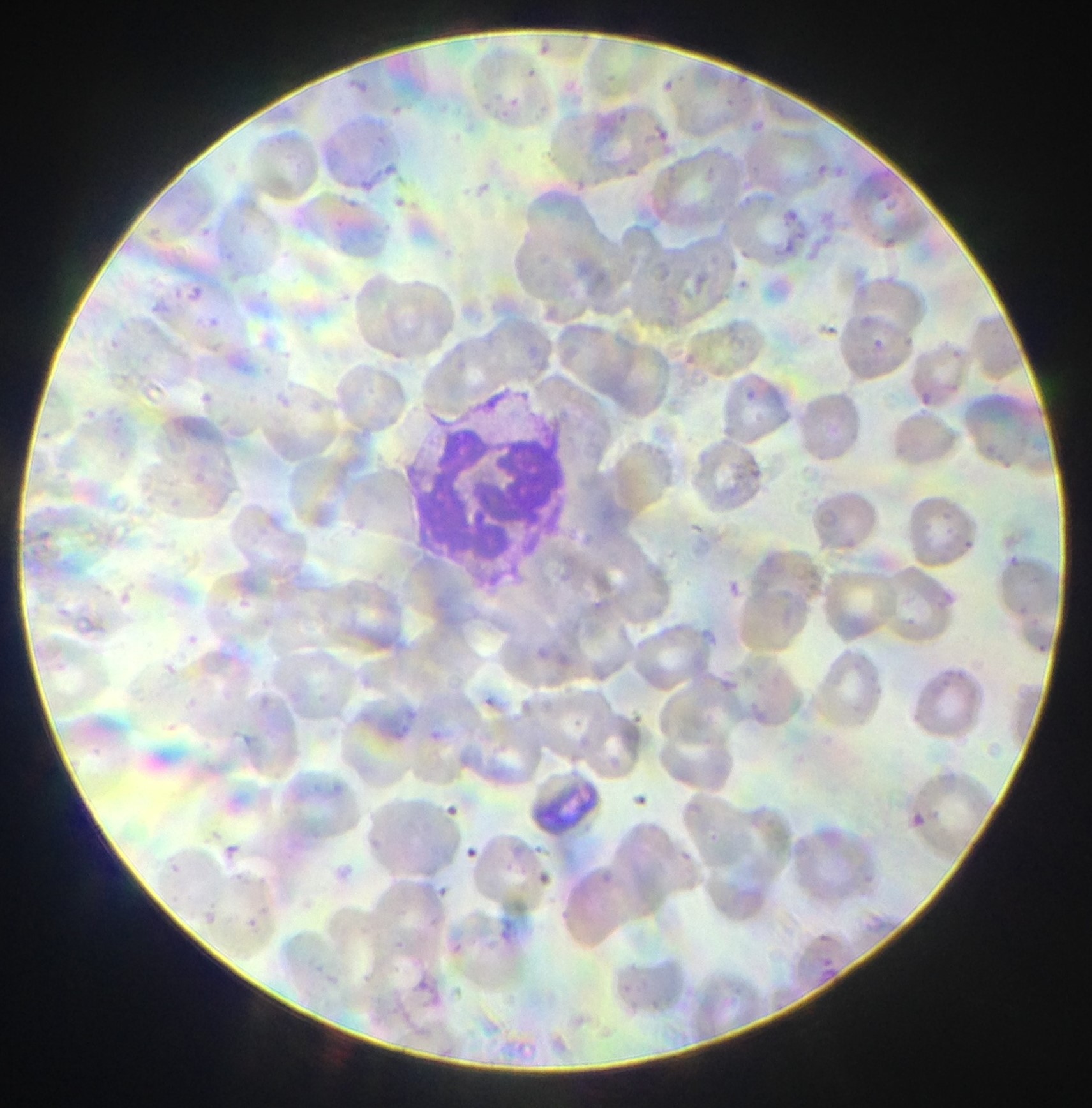 мазок крови окрашенный по Романовскому, объектив 90х, окуляр 10х, бинокулярная насадка 1.5х. иммерсионное масло на препарате, глицерин на конденсорной линзе, освещение светодиод, честно говоря стыдно показывать, но все же выложу  Просмотров: 2198