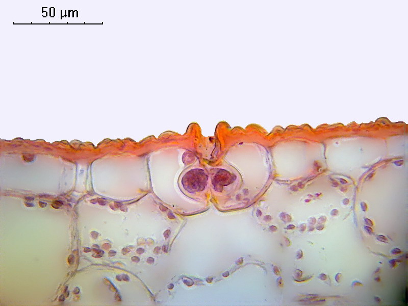 Снимок 3. Парафиновый срез (последовательность обработки: фиксация, обезвоживание, пропитка парафином, резка, депарафинирование, пропитка водой, окраска). В центре снимка устьице. Краситель тот же, что и в предыдущем случае. Рыжий цвет кутикулы от хризоидина. Ядра эпидермы и хлоропласты сиреневые - совместное действие сафранина и анилинового голубого.