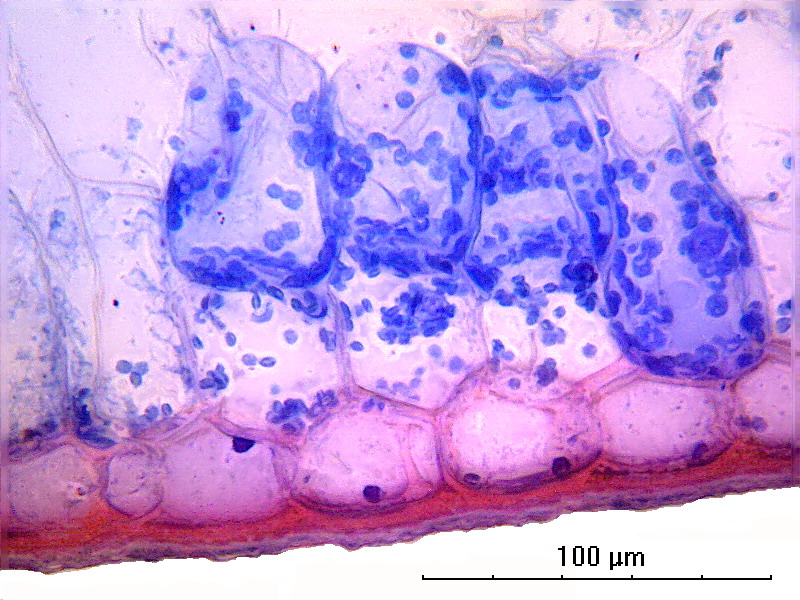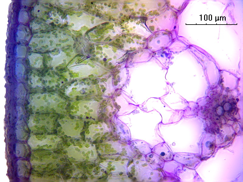 Снимок 2. Поперечный срез листа, зафиксирован в смеси этилового спирта, формалина и уксусной к-ты (фиксатор ФАА). Фиксатор разрушает (или растворяет) хлорофилл в хлоропластах. Окраска по Этцольду. Кутикула окрасилась в красный цвет сафронином, ядра эпидермальных клеток - окрасились в сиреневый цвет фуксином, хлоропласты окрасились в синий цвет анилиновым голубым (водорастворимым). Объектив 40х/0,65.