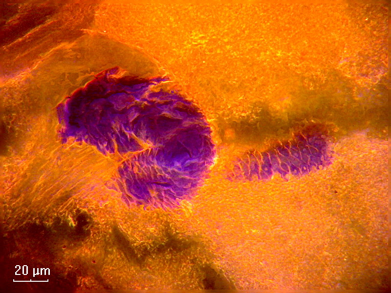 Снимок 3. Парафиновый срез (последовательность обработки: фиксация, обезвоживание, пропитка парафином, резка, депарафинирование, пропитка водой, окраска). В центре снимка устьице. Краситель тот же, что и в предыдущем случае. Рыжий цвет кутикулы от хризоидина. Ядра эпидермы и хлоропласты сиреневые - совместное действие сафранина и анилинового голубого. Нет, слов красота!