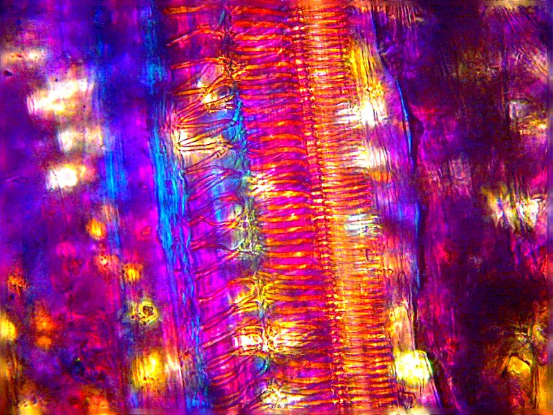 Фото 2. Тот же луковый "пейзаж", но между объективом и анализатором установлен компенсатор лямбда, оси которого ориентировны под углом 45 градусов к осям анализатора. Компенсатор лямбда еще называется красной (гипсовой) пластиной первого порядка или целоволновой пластиной.