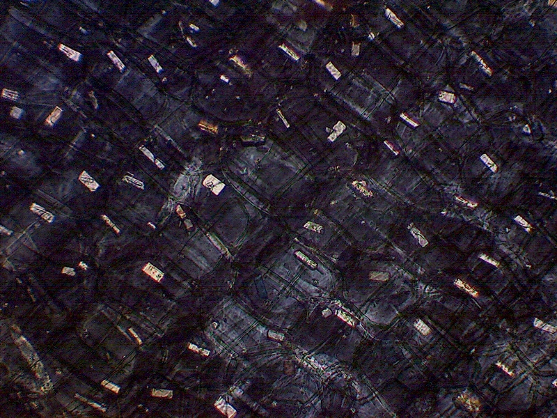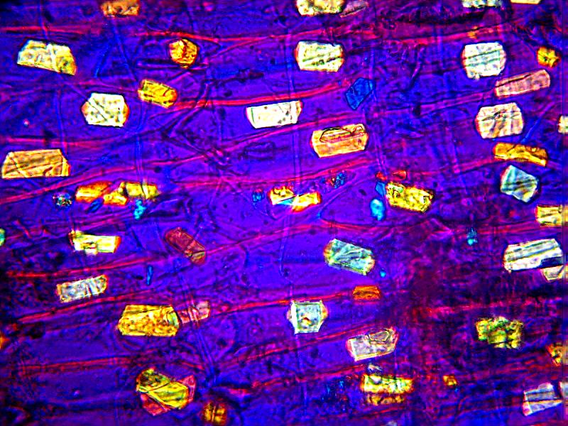 Кристаллы оксалата кальция в сухой кожуре луковичных. Именно кристаллы окаслата кальция "отвечают" за специфический блеск луковой кожуры в ярких лучах света.