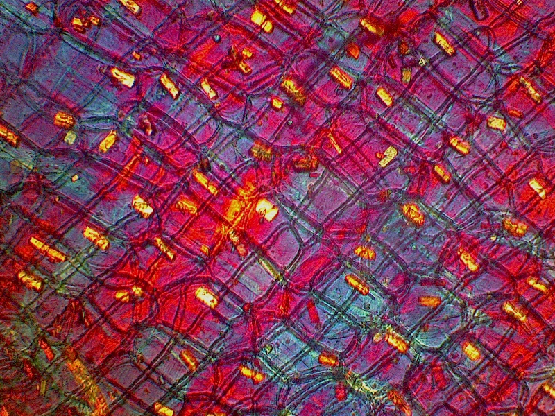 Фото 1. Вид кожуры лука в скрещенных поляроидах. Поляризатор установлен под конденсором, анализатор - между объективом и окуляром.