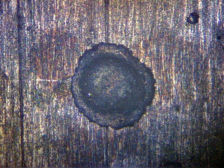 Поверхность металла в отраженном свете (освещение с помощью опак-иллюминатора). Ямка кислотного травления. Объектив для проходящего свтеа 20х/0,4 на тубус 160 мм.