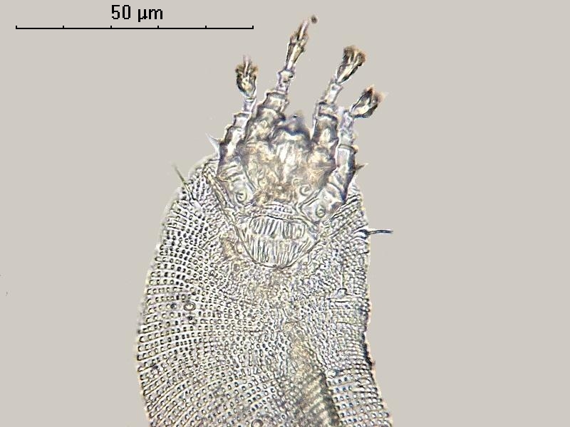 Виноградный клещ. Объектив 90х/1,25 МИ. Клещ "пойман" на прозрачный канцелярский скотч, который и выполнил роль покровного стекла.