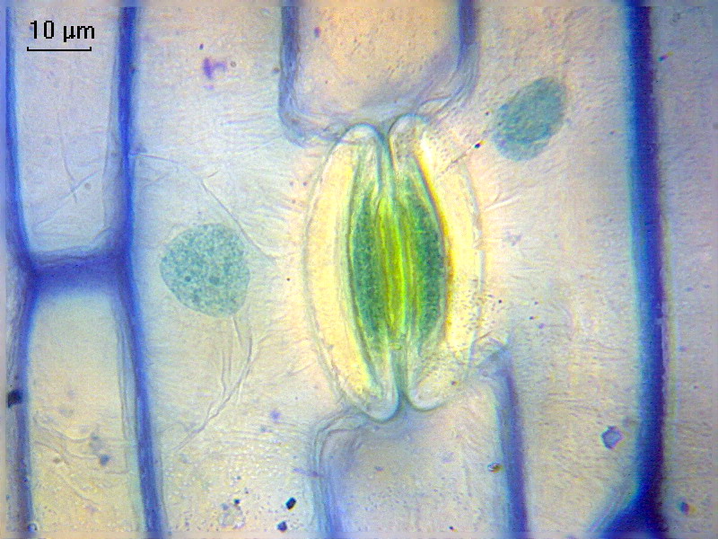 Из свежих наблюдений. Устьице в эпидерме тюльпана. Окраска азур+хризоидин, заключение в полистирол без покровного стекла, наблюдение с масляной иммерсией, 90х/1,25. Для того, чтобы устьичные клетки и ядро обычной клетки слева от устьица были хорошо видны одновременно, пришлось применить стекинг. За ядром справа "не охотился", поэтому оно не четко видно. Сравните с окраской фуксином: viewtopic.php?f=11&t=8887&start=50#p34412 или водным синим и хризоидином viewtopic.php?f=11&t=11388&start=40#p34258. Эта окраска мягче "рисует" содержимое ядер. Зеленый цвет устьица не является натуральным, это есть результат смешения синего азура и желтого хризоидина. Еще один момент - азур, точнее, краситель "азур-II", обычно используемый для окраски мазков крови по Романовскому, на самом деле является смесью собственно азура и метиленового синего; на снимке интенсивно-синие клеточные стенки по-видимому захватили именно азур, а ядра окрашены более мягким голубым цветом - это, наверное, метиленовый синий.