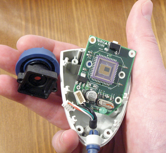 Шаг №2. Начнём с Web камеры. Разберите её и удалите все элементы корпуса, удалите оптический блок (объектив). Нас интересует только логическая плата и сенсор (матрица). На время отсоедините контакты питания. На фото ниже всё прекрасно видно. Выкинули две половинки корпуса, убрали объектив.