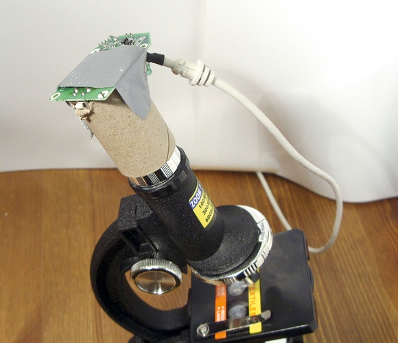 Шаг №4. Вставьте окуляр в картонную трубку и зафиксируйте клеем. Когда клей высохнет — вставьте окуляр на своё место. Далее подключите элементы питания к камере и вставьте её в Ваш ПК. Ориентируясь по изображению на компьютере подберите необходимое положение камеры, чтобы центр сенсора совпадал с центром окуляра, карандашом отметьте это положение. Выньте картонную трубку вместе с окуляром и с другой стороны наклейте на неё камеру. Готово. Теперь можете пользоваться. Теперь значительно удобнее, Вы видите всё на экране, Вам нет необходимости щуриться, Ваша шея отдыхает, так как она не наклонена к окуляры. Теперь можно удобно сесть сразу всей семьёй и понаблюдать, не нужно ждать своей очереди. Можно делать фото и видео.