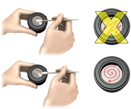 Медицинская груша является самым безопасным средством для очистки оптики и её необходимо применять первой. Сдуйте с её помощью пыль со всех доступных оптических поверхностей. Далее при помощи сухой салфетки для оптики можно удалить более серьёзный загрязнения. Если останутся после этого грязные места, то можно применить жидкость для оптики.