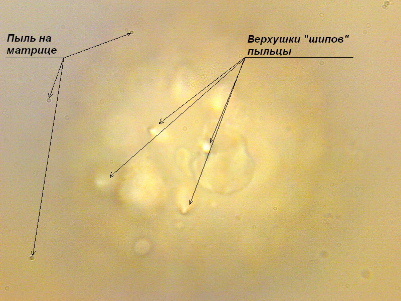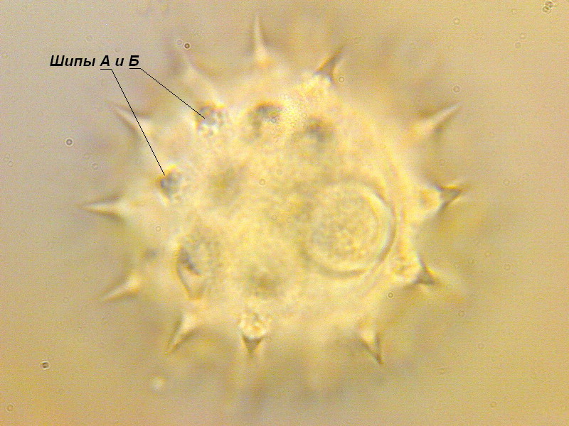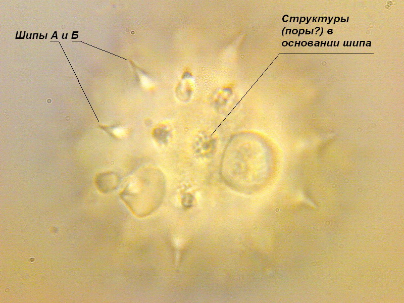 Фото 2. В фокусе основание центрального шипа. Видны черные пятнышки, по-видимому, это поры, проходящие через стенку частицы. Структура этих пор будет или потеряна на результирующем снимке, или показана с плохим разрешением. Также видны светлые верхушки других шипов (А и Б).