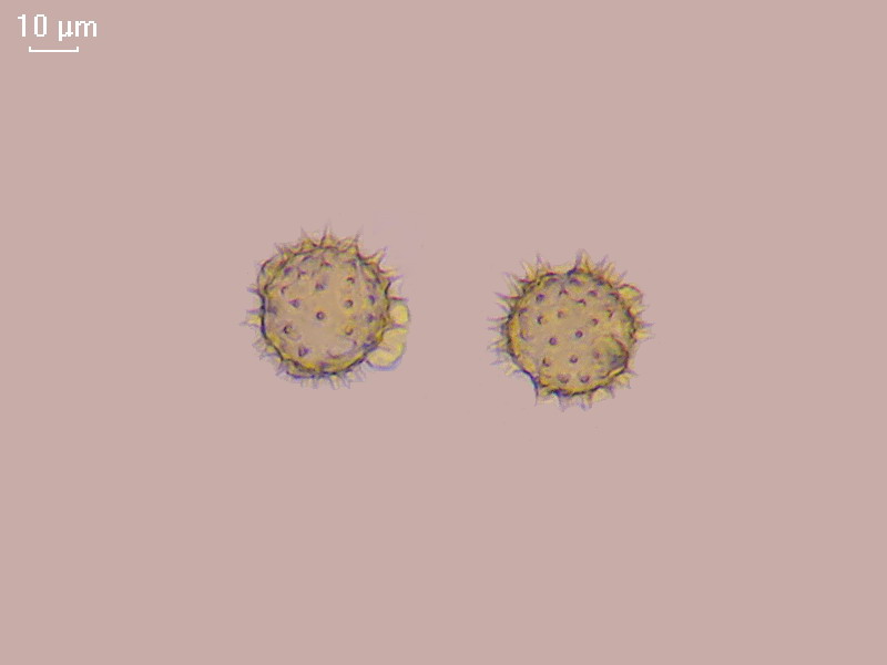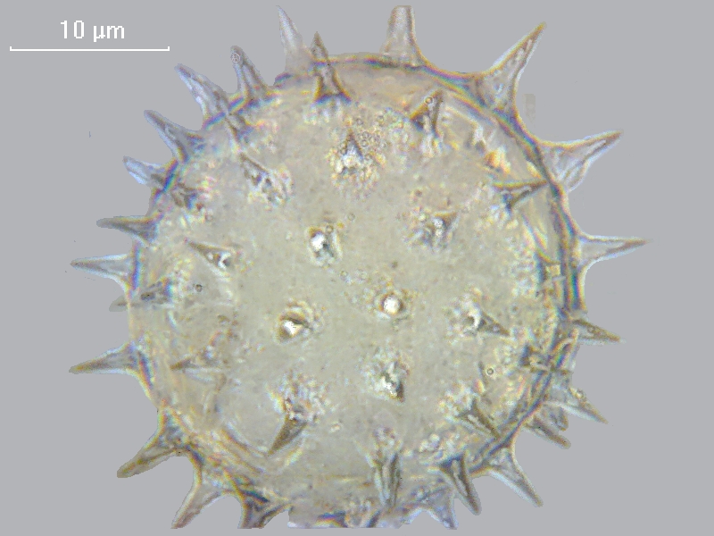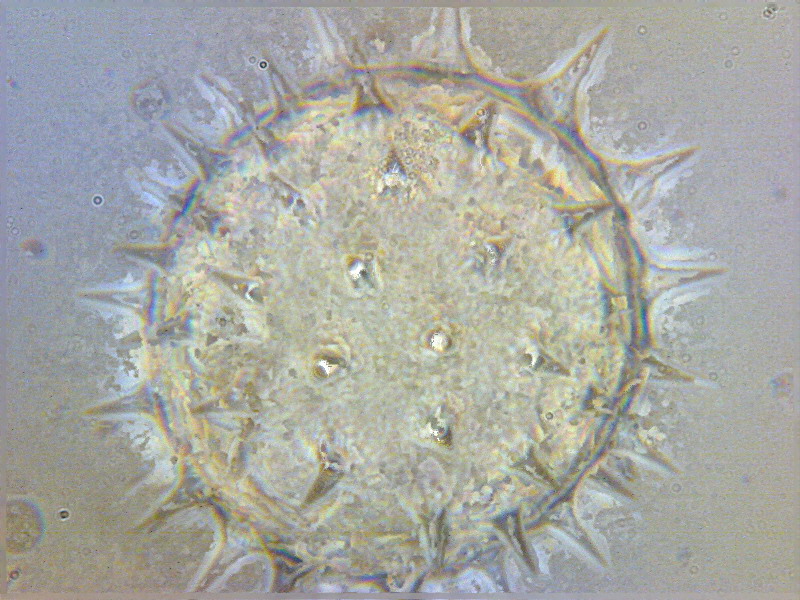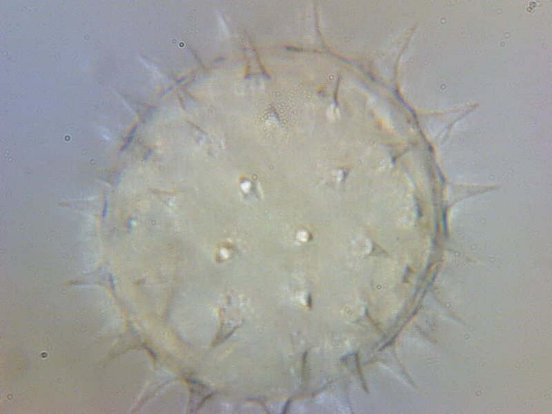 Теперь о глубине резкости. Программа Micam позволяет измерять размеры и расстояния, если ее прокалибровать с помощью объектов известных размеров, например, с помощью объект-микрометра. Это достаточно сделать один раз для каждого объектива и каждого адаптера камеры. Все приведенные мною размеры получены именно таким образом. По последним двум фото определяем, что а) диаметр шарика пыльцы составляет 28 мкм, высота одного шипа колеблется от 5 до 6 мкм. На фото 2 мы видим верхушки шипов А и Б, на фото 3 – их основания; от центра изображения до оснований примерно по 7,5 мкм. Из элементарной геометрии оцениваем угол наклона шипа к вертикали – чуть более 30 градусов. Таким образом, видимая проекция шипа примерно в 2 раза меньше его натуральной величины. Если считать, что в резкости лежат темные части шипов А и Б (а это около 1,5 мкм на картинке), то глубину резкости можно оценить в 3 мкм.
