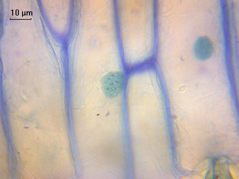 О препарате. Эпидерма листа тюльпана; окраска: азур + хризоидин; заключение в полистирол без покровного стекла, специально для наблюдения с маслянной иммерсией. Цель: рассмотреть структуры в ядре клетки.