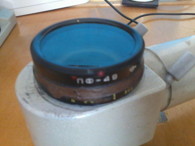 А вот несколько фото с моего БИОЛАма, на котором самодельный тубус для поляризации. В качестве анализатора я использую встроенный туда поляризационный фильтр ПФ-36, а компенсаторы у меня настоящие, от поляризационного микроскопа МИН-8, и размещаются они в тубусе между объективом и анализатором.