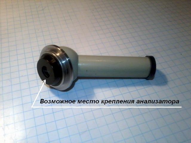 Фото 1. Монокулярная насадка МОН-1 от микроскопов МБИ/МБР/МБД и БИОЛАМ. Возможное место крепления поляроида, выполняющего роль анализатора, - снаружи входной диафрагмы насадки.