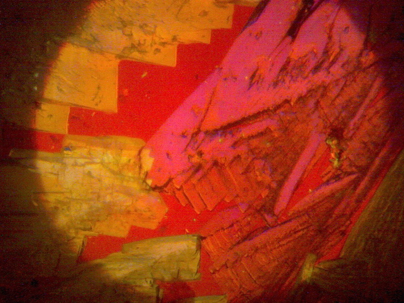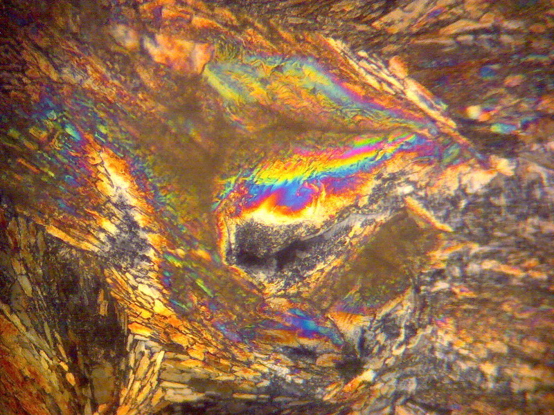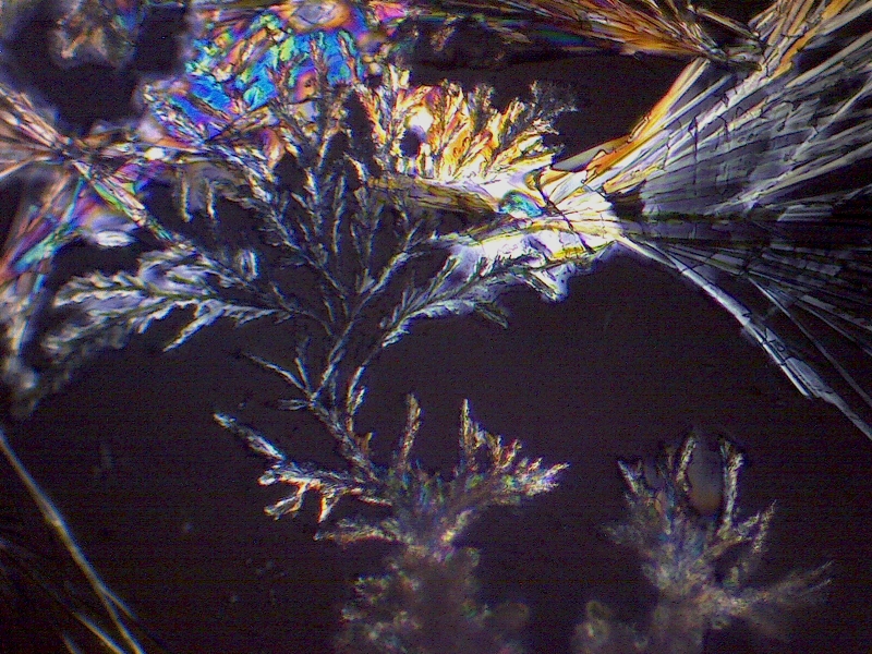 На фото 2 - кристаллы пиперина, образовавшиеся из расплава между предметным и покровным стеклом. Поляроиды скрещены, введен компенсатор.