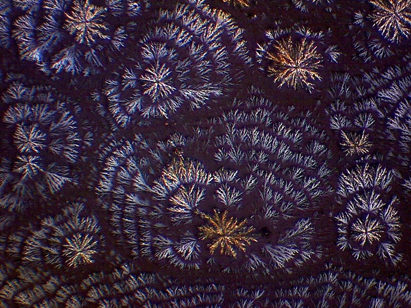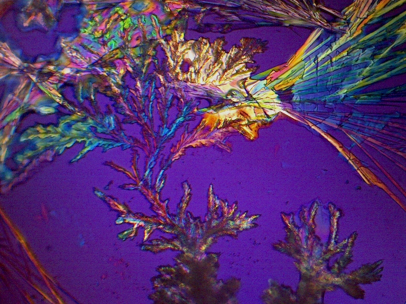 Фото 1 и 2 - зимние фантазии пищевой соды (бикарбонат натрия, высохшая капля раствора на предметном стекле, поляроиды скрещены, без компенсатора)
