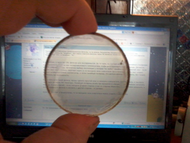 Если у кого есть такой фильтр, прошу сделать простой опыт и написать о результате. Берёте фильтр, и смотрите через него на экран ЖК-монитора. Линейный поляроид дожен при вращении в определенном положении затемнять монитор (см. фото). А циркулярный - если смотреть с одной стороны (глаз со стороны объектива), то должен затемнять, а если перевернуть фильтр и смотреть с другой стороны - то не должен.