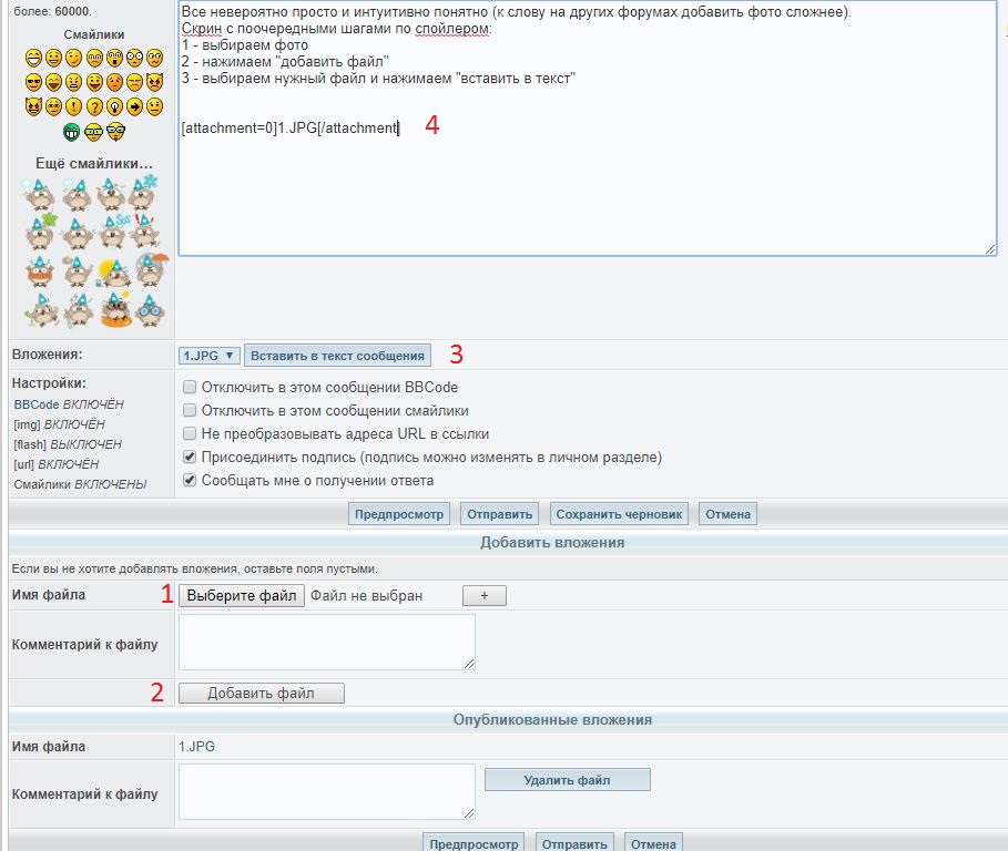 Все невероятно просто и интуитивно понятно (к слову на других форумах добавить фото сложнее). Скрин с поочередными шагами по спойлером: 1 - выбираем фото 2 - нажимаем "добавить файл" 3 - выбираем нужный файл и нажимаем "вставить в текст" 4 - на месте курсора видим вставленный файл Естественно фото не должно превышать 800кб. сжать фото можно почти в любом фоторедакторе.  Просмотров: 4105