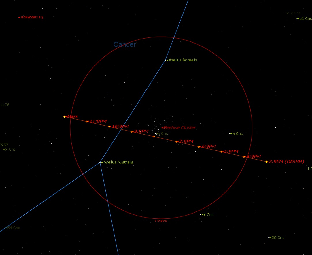 Двигаясь по орбите, четвертая от Солнца планета Марс (или как его еще называют Бог войны) для земного наблюдателя перемещается на фоне более удаленных звезд. И в первой половине сентября 2013 года в своем движении Марс пересечет рассеяное звездное скопление М44 (второе название Ясли), расположенное в зодиакальном созвездии Рак.