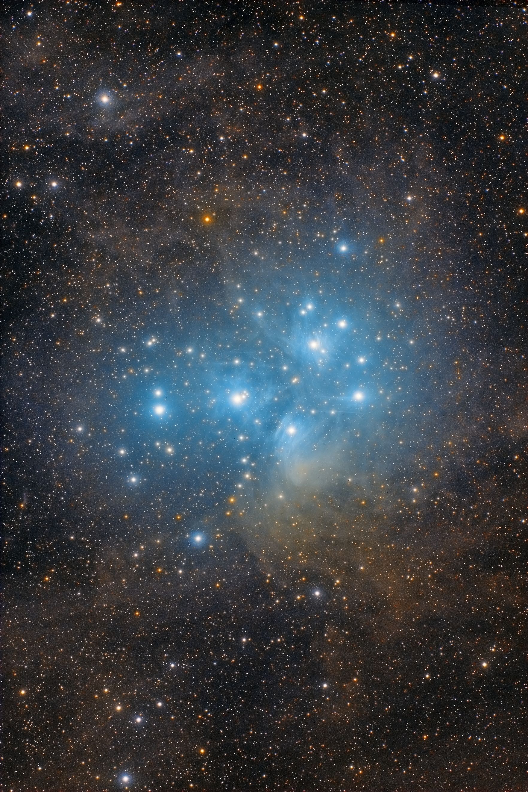 Многие любители астрономии безусловно наблюдали звездное скопление Плеяды. В небольшой бинокль, телескоп или даже невооруженным глазом это скопление нетрудно найти на фоне созвездия Тельца. Это скопление известно также под названиями Стожары, Семь Сестер, М45 и т.д. Визуально, мы наблюдаем то или иное количество звезд в зависимости от величины нашего оптического прибора. В крупные телескопы, под темным, прозрачным небом опытный наблюдатель может заметить небольшие туманности вокруг ярких звезд. Использование же фотографии с длительными выдержками позволяют раскрыть настоящий вид этого звездного семейства, погруженного в огромнное газо-пылевое облако, в котором продолжается процесс рождения звезд.