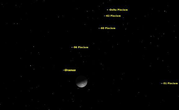 В восточной части Северной Америки 28 декабря в воскресенье в 11.30 по североамериканскому времени наблюдатели смогут увидеть Луну, которая будет находиться чуть ниже Урана. Посмотрите на небо в воскресенье 28 декабря, чтобы увидеть, как близко Луна приблизится к планете Уран. Теоретически, Уран можно увидеть невооруженным взглядом, но большинству из нас понадобится бинокль для того, чтобы полюбоваться на эту планету. Чтобы увидеть Уран, направьте бинокль чуть вверх и левее Луны, и вы заметите нечеткое сине-зеленоватое пятно, цвет которого нехарактерен для звезд. Но только через большой телескоп далекий Уран виден не как звезда. Лучше всего наблюдать за небом около 11.30 по североамериканскому восточному времени, когда луна находится на такой высоте, что Уран еще можно разглядеть. Следует обратить внимание на звезды вокруг Урана и Луны в созвездии Рыб, а именно на звезду под номером 96, прямо над Луной. Из-за вращения Земли кажется, что Луна, Уран и все звезды вокруг движутся по направлению к западному горизонту. Луна также движется, но в противоположном направлении. Проследите за тем, как Луна движется в противоположном направлении от звезд. Возможно, вам удастся увидеть, как Луна проходит прямо перед звездой 96 в созвездии Рыб. Такое явление называется покрытием. Обычно, когда Луна проходит перед какой-либо звездой, звезда пропадает и вновь появляется, как будто кто-то ее выключил и снова включил. Это потому, что у луны нет атмосферы, и она не может закрывать звезду постепенно. Иногда даже звезда может скрыться за горой на краю Луны и появиться секундой позже. Какую именно звезду затмит Луна зависит от того, где вы находитесь. Луна располагается очень близко к Земле, что создает параллакс. То же самое происходит, когда вы держите палец близко к глазам, стараясь рассмотреть какой-либо предмет вдали.