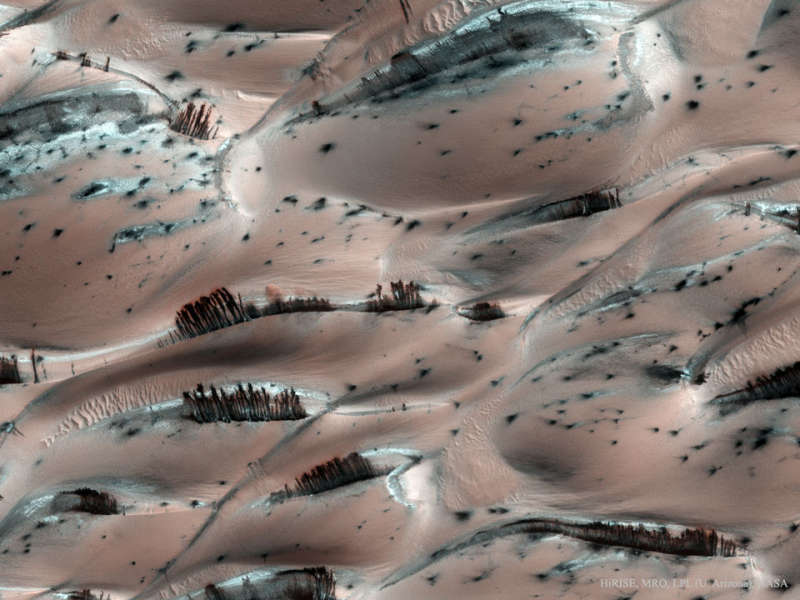 Может показаться, что на Марсе выросли деревья, но на самом деле это не так. Группы из темно-коричневых полосок были сфотографированы "Марсианским орбитальным разведчиком" на оттаивающих розоватых песчаных дюнах, покрытых легким инеем. На изображении видна область около северного полюса Марса, оно было получено в апреле 2008 года. В это время темный песок на внутренних частях марсианских песчаных дюн становился все более заметным, так как весеннее Солнце растопило легкий лед из углекислого газа. Если темный песок находится около вершины дюны, он может сползать вниз, оставляя на поверхности темные полосы. На первый взгляд может показаться, что это – деревья, стоящие перед более светлой областью, однако не отбрасывающие тени. На этом изображении, охватывающем область с поперечником примерно в один километр, можно различить объекты размером около 25 сантиметров. Если увеличить некоторые части изображения, то можно увидеть вздымающиеся облака пыли, показывающие, что песчаные оползни происходили в то время, когда осуществлялось фотографирование.
