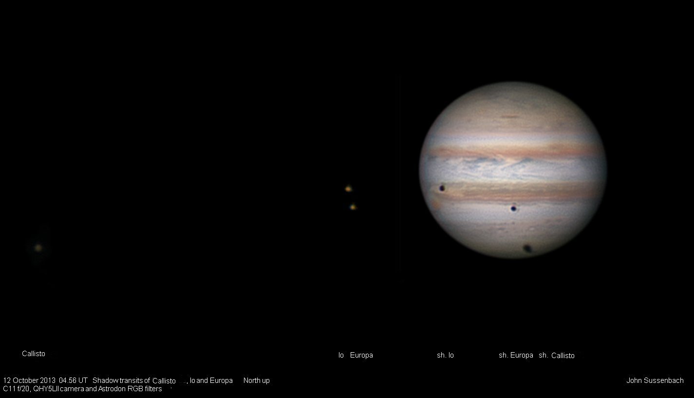 В ночь с 11 на 12 октября 2013 года произойдет довольно редкое астрономическое явление - тройное солнечное затмение на Юпитере. Три галлилеевых спутника одновременно отбросят свои тени на диск планеты-гиганта. Явление начнется в 4 часа 32 мин по Всемирному времени и продлится чуть более одного часа. На рисунке-симмуляторе мы можем видеть примерно середину этого явления: слева Каллисто, ближе к диску Юпитера Ио (выше) и Европа, на диске Юпитера тени Ио, Европы и Каллисто (слева на право). Явление будет наблюдаться в западном полушарии Земли.