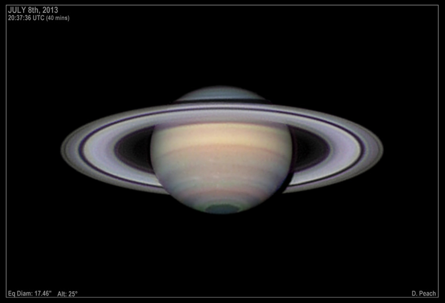 Дамиан Пич из Великобритании побывал на Олимпе, Кипр, на высоте 1900 метров над уровнем моря 20 апреля 2013. В это время Сатурн находился в противостоянии с Солнцем, т.е. на минимальном расстоянии от Земли. С помощью небольшого телескопа Пич получил стек из нескольких тысяч кадров. Сложенные вместе, они и дали представленное здесь изображение Источник: Новости Facenews - http://www.facenews.ua/multimedia/2013/175396/Невероятно четкий портрет планеты с развернутыми кольцами позволяет нам увидеть тонкие полосы разноцветных облаков и три вершины гексагонального шторма над Северным полюсом (нижняя часть снимка). Загадочный шторм в форме шестиугольника со стороной 13 800 км, то есть больше диаметра Земли, был обнаружен космическими аппаратами Вояджер 1 и 2, и продолжает существовать до сих пор. Система колец Сатурна порадовала автора фотографии и жюри конкурса изысканными градациями яркости и цвета. Самое яркое кольцо B отделено от большего по размеру кольца А относительно пустой областью шириной почти 4000 км, которая называется делением Гюйгенса-Касиини, еще одна темная полоса по внешнему краю кольца А, носит имя Энке. К внутреннему краю кольца В примыкает более слабое кольцо С. Даже предельно слабое внутреннее кольцо D тоже прекрасно видно. Внешний диаметр кольца А 274 тысячи километров, при этом толщина колец меньше километра. Просветы в кольцах связаны с его спутниками. Работа Дамиан Пича переворачивают наши представления о том, что может быть достигнуто с любительскими телескопами. Источник: Новости Facenews - http://www.facenews.ua/multimedia/2013/175396/