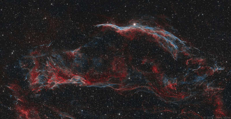 Изящные волокна из светящегося газа, сжатого ударной волной, украшают небо планеты Земля в созвездии Лебедя. Это – западная часть туманности Вуаль. Сама туманность Вуаль – это огромный остаток сверхновой, расширяющееся облако, образовавшееся после смертельного взрыва массивной звезды. Свет от вспышки сверхновой достиг Земли более 5 тысяч лет назад. Порожденная этим катастрофическим событием межзвездная ударная волна рассекает космическое пространство, сгребая и возбуждая межзвездное вещество. Светящиеся волокна на самом деле больше похожи на длинные волны на поверхности, которые мы видим сбоку. В них удивительно хорошо разделены атомы водорода (светятся красным цветом) и кислорода (сине-зеленым цветом). Туманность Вуаль, известная также как Петля в Лебеде, занимает на небе область размером около 3 градусов, что в 6 раз больше диаметра полной Луны. На расстоянии в 1500 световых лет это соответствует размеру более 70 световых лет. Эта картинка, составленная из двух телескопических изображений западной части туманности, охватывает примерно половину диаметра. Самые яркие части западной Вуали считаются отдельными туманностями. Это – Ведьмина метла (NGC 6960) вдоль верхнего края картинки и Треугольник Пикеринга (NGC 6979) ниже и левее центра. Авторы и права: Данные: Стив Милн и Барри Уилсон