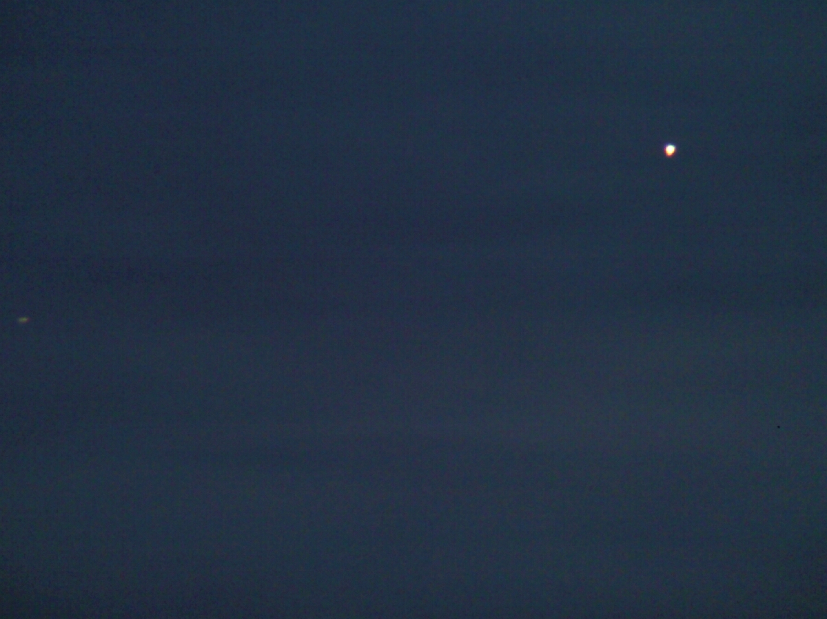 «Квази-соединение» двух планет,как писал Андрей Москвин... 10 января посмотреть не удалось из-за отсутствия неба. Сегодня небо дали часов в 11 был доволен и ждал вечера. Пришёл вечер и пришло недовольство,небо именно на западе(куда должен был смотреть) затянуло тучами.