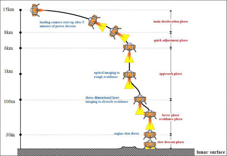 Что касается подробностей прилунения, то аппарат начал спуск на Луну с первоначальной 15-километровой орбиты на скорости 1,7 км/ч. При достижении высоты в 6-8 километров он произвел оценку своего местоположения. На высоте порядка 100 метров при помощи посадочных двигателей «Чанъэ-4» приостановил снижение, чтобы изучить, нет ли в зоне видимости каких-либо неровностей, которые могли бы помешать мягкой посадке. После этого зонд медленно сел на относительно плоскую поверхность в огромном ударном кратере Карман (район бассейна Эйткена), расположенном в не видимом для землян южном полушарии.