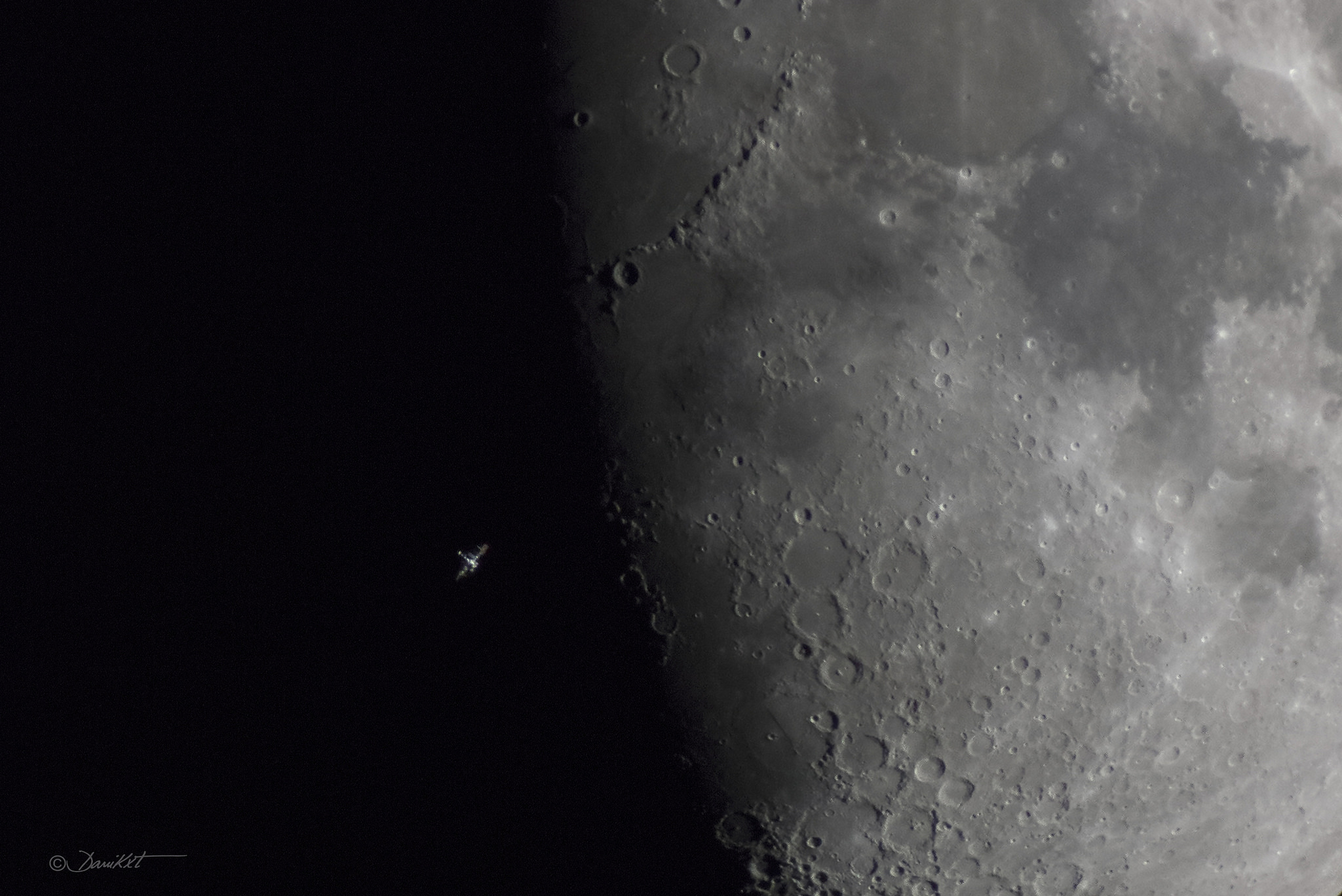 Космическая станция над лунным терминаторомЧто это такое на фоне Луны? Это – Международная космическая станция. В прошлом году, точно выбрав время, удалось сфотографировать обращающуюся вокруг Земли космическую платформу перед частично освещенной Луной. Снимок был сделан из Мадрида в Испании с экспозицией всего 1/1000 секунды. Продолжительность пролета МКС по диску Луны – около половины секунды.