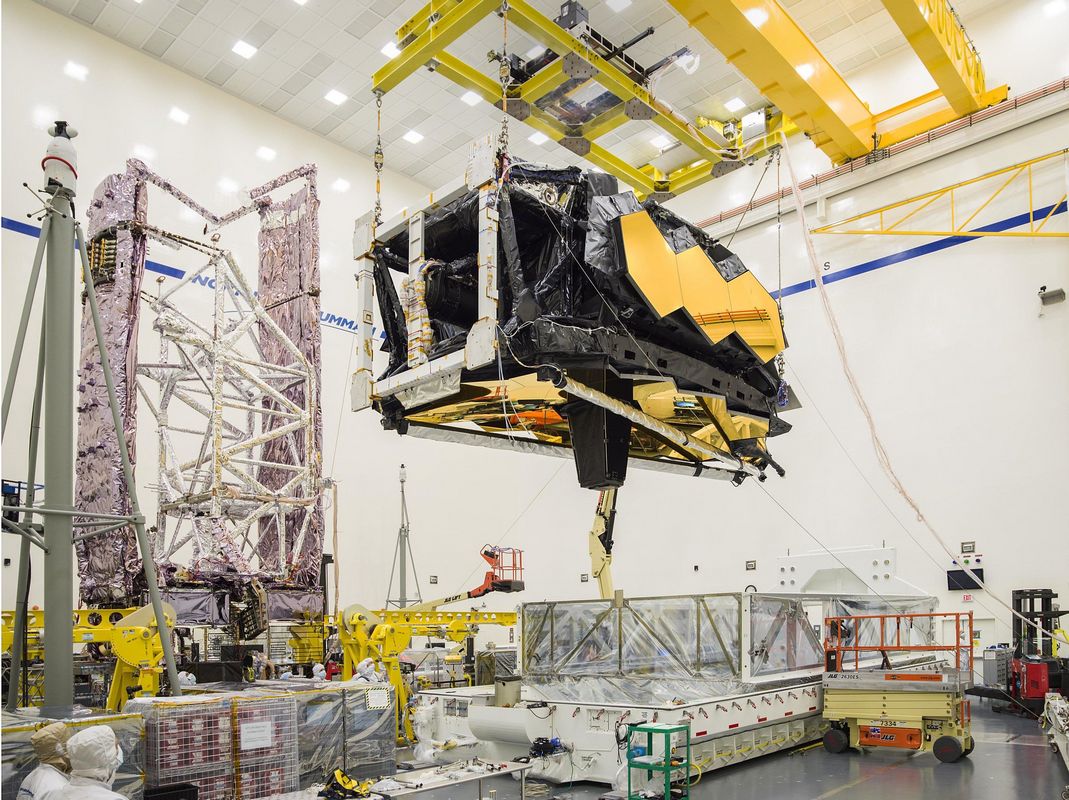 Космическая обсерватория James Webb готовится к новым испытаниямИнженеры извлекли сборку оптических и научных инструментов космического телескопа НАСА James Webb («Джеймс Уэбб») из контейнера, в котором она была доставлена в специальное помещение компании Northrop Grumman Aerospace Systems, расположенное на территории штата Калифорния, США, 8 марта, ознаменовав тем самым начало нового этапа сборки и испытаний будущего космического телескопа. Этот сборочный цех является конечной точкой маршрута космического телескопа, который после окончания сборки будет направлен для запуска к космодрому Куру, Французская Гвиана. Инженеры проведут в этом цехе заключительные испытания, которые призваны подтвердить готовность обсерватории быть отправленной в космос. Сборка оптических и научных инструментов телескопа, или его научное оборудование, является той половиной конструкции обсерватории, которая включает легендарное 6,5-метровое золотое основное зеркало. Эти инструменты прибыли в помещение компании Northrop после успешного завершения испытаний в Космическом центре Джонсона НАСА в Хьюстоне. Собранный остов космического телескопа и солнечный экран – вторая половина обсерватории, сборка которой проводится в настоящее время здесь же, в Калифорнии – вскоре пройдет собственные испытания, имитирующие условия, возникающие при запуске, чтобы подтвердить готовность к объединению со сборкой научных инструментов. Затем будут проведены дополнительные испытания, которые призваны гарантировать, что обсерватория сможет успешно работать, находясь на орбите во второй точке Лагранжа системы Солнце-Земля (L2). Основную сложность в этих испытаниях будут представлять операции по развертыванию обсерватории, поскольку предполагается, что обсерватория при запуске будет находиться на борту ракеты Ariane 5 в свернутом, компактном состоянии. Космический телескоп James Webb НАСА является самой мощной в мире космической инфракрасной обсерваторией, которая станет основным инструментом астрономов на следующее десятилетие. По информации НАСА