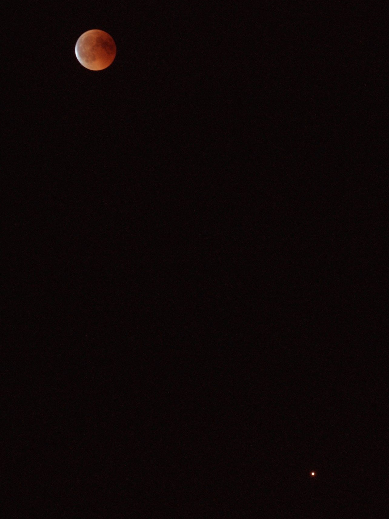 Вот и полное затмение наступило. Восточная часть Луны заметно темнее, красноватый оттенок хорошо различается в монокуляр. Картину портит заметная дымка. Ниже Луны сверкает оранжевый Марс.