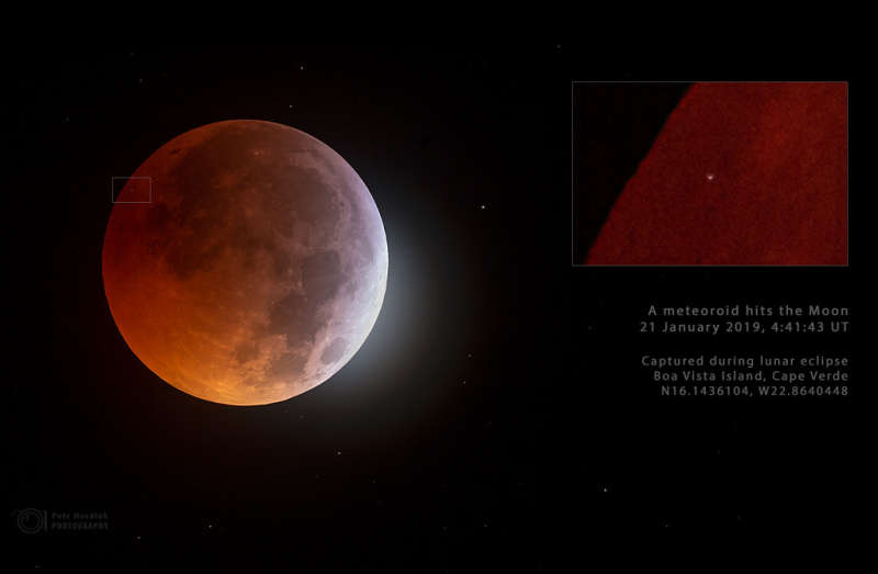 Во время полного лунного затмения 21 января многие фотографы случайно запечатлели вспышку от удара метеороида на тусклой красной Луне. Вспышка была обнаружена на снимках, сделанных перед началом полной фазы затмения. Она произошла около потемневшего западного лимба Луны и показана на врезке. Продолжительность вспышки была установлена по данным наблюдений телескопов системы обнаружения и анализа ударов на Луне (Moon Impact Detection and Analysis System – MIDAS) на юге Испании. Получена оценка массы метеороида – около 10 килограммов, после удара должен образоваться кратер диаметром от семи до десяти метров.