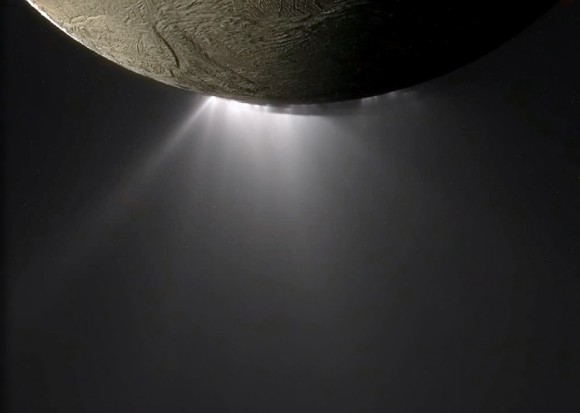 Благодаря миссии Cassini стало известно о струях ледяной соленой воды, разбрызгиваемой из южного полюса луны Сатурна Энцелад. Что примечательно эти ледяные частицы содержат соли и органические соединения. Струи постоянно распыляют мелкие частицы льда в космос, которые выходят на орбиту вокруг Сатурна, создавая туманное, расплывчатое кольцо E, в котором обитает Энцелад. Для подобных процессов необходима заключительная энергия которую нельзя объяснить лишь внешними факторами. Исследователи полагают, что тепловая энергия переносится вверх вместе со сдавленным водным паром из подповерхностного океана. Охлажденный пар вырывается из 98 отверстий наблюдаемыми сейчас на ландшафте южного полюса Энцелада. Это значит, что луна Сатурна не только имеет значительный подповерхностный океан жидкой воды с горячим источником и соленостью как на Земле, но и разбрызгивает этот океан, эту потенциально обитаемую среду, наружу в местный космос, где ее можно изучать относительно просто - делая Энцелад очень интригующей целью для будущих экспедиций.
