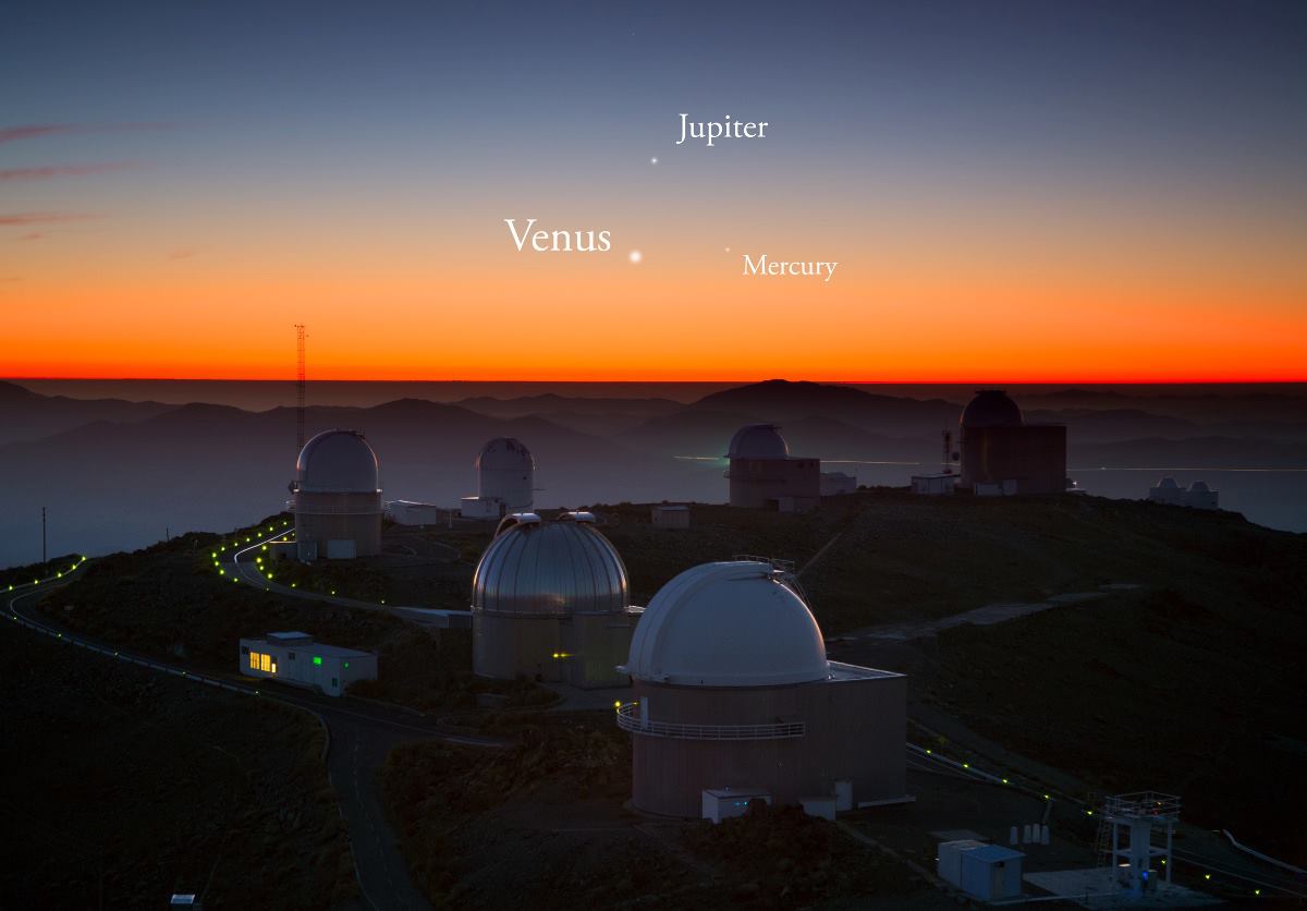 В минувший вторник Юпитер, Венера и Меркурий собрались вместе низко в северо-западной части вечернего неба, и сформировали самую тесную группу из трёх видимых невооружённым глазом планет, которую можно увидеть вплоть до 2026 г. Фото внизу иллюстрирует это редкое небесное явление. На переднем плане можно увидеть многочисленные телескопы ESO обсерватории Ла Силла.