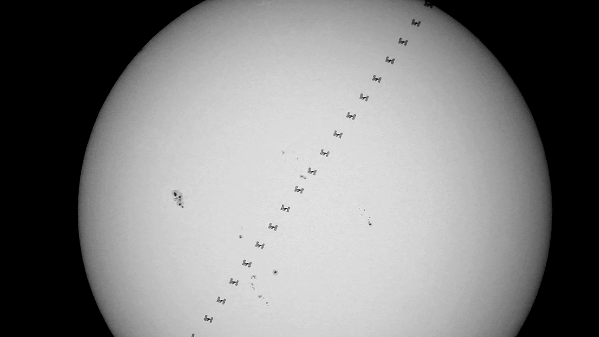 В своем движении по орбите вокруг Земли Международная Космическая станция (МКС или ISS) довольно часто проецируется на диск Солнца или Луны. Именно такой транзит удалось зафиксировать американскому астроному-любителю с помощью зеркального фотоаппарата и такого телескопа http://astroscope.com.ua/teleskop_celes ... lt/310.htm.