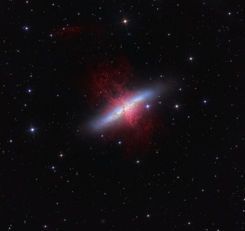 Галактика M82, имеющая необычную веретенообразную форму, отличается интенсивным звездообразованием и огромными выбросами атомарного водорода. Голубой цвет "веретена" и есть следствие излучения молодых горячих звезд, а атомарный водород образует красивый вуалевый узор красного цвета, расположенный перпендикулярно плоскости галактики.