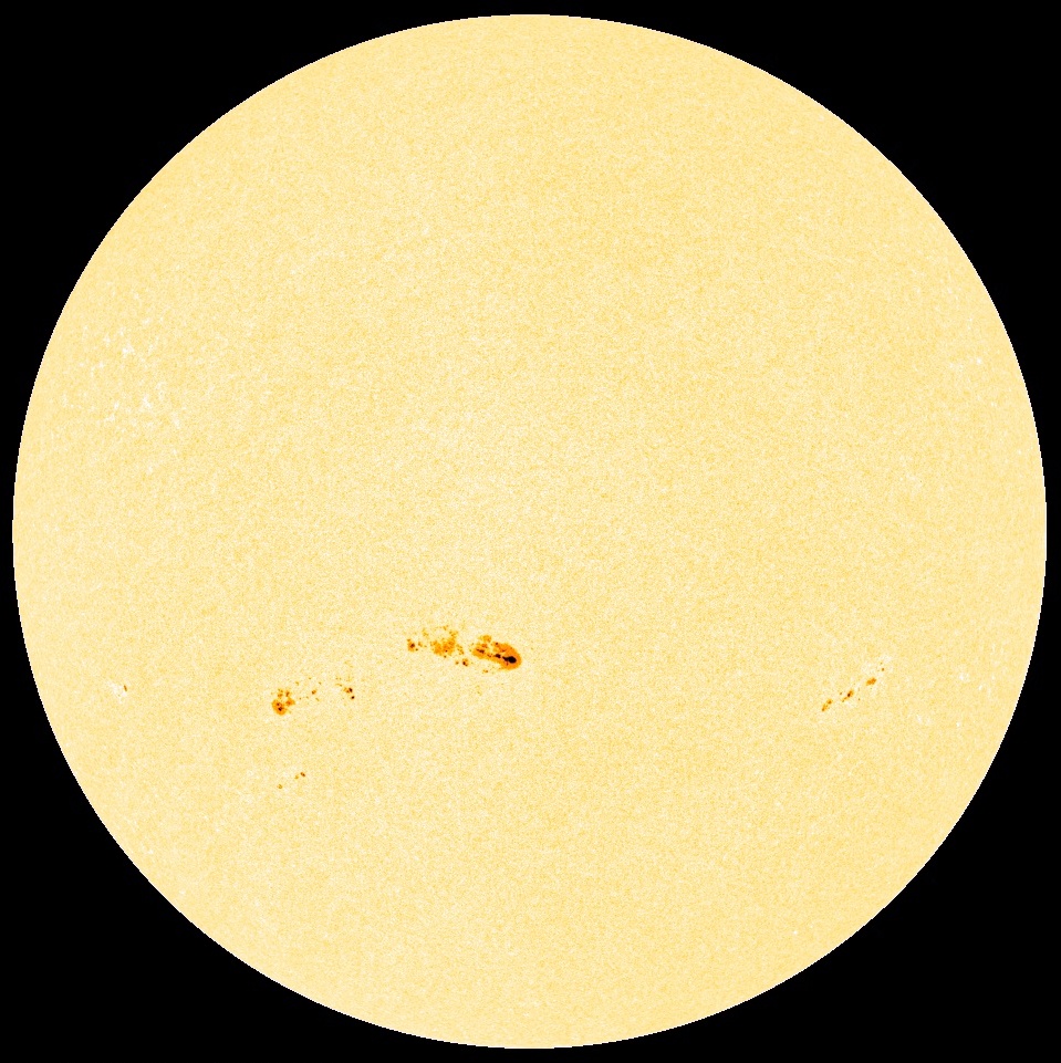 Сегодня и завтра через центральный меридиан Солнца проходит необычайно крупная группа пятен с ведущим пятном размером больше, чем Земля. Рассмотреть это эффектное зрелище можно даже в самые небольшие телескопы, а люди с острым зрением могут увидеть пятно даже невооруженным глазом.