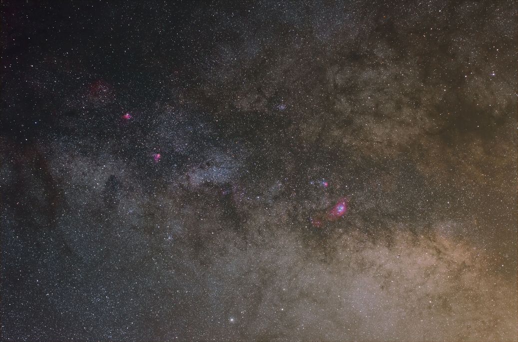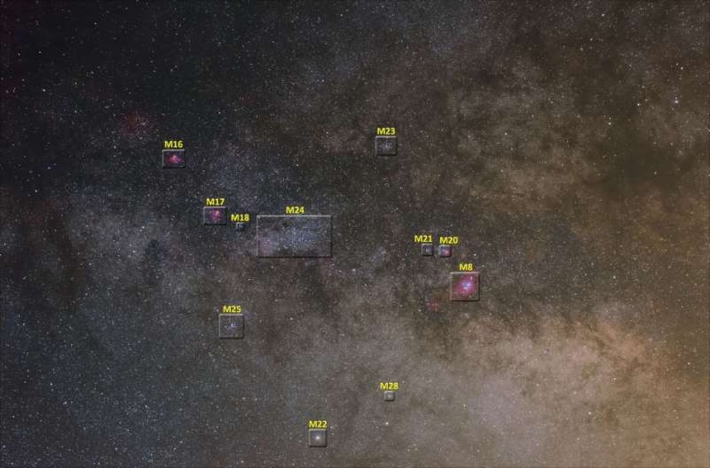 Лето - наилучшее время наблюдения богатых звездных полей вблизи центра нашей Галактики. Найти интересные объекты в этом разнообразии Вам поможет широкоугольный снимок созвездия Стрельца испанского любителя астрономии Фернандо Кабреризо. На нем поместилось одинадцать объектов из каталога Мессье - известного "ловца комет" XVIII века. Центр Млечного Пути расположен в нижнем правом углу снимка и закрыт плотными газо-пылевыми облаками. А левее и выше от него Вы найдете яркие эмиссионные туманности M8 "Лагуна", M20 "Трехраздельная", M17 "Омега" и M16 "Орел", они выделяются красноватым цветом излучения водорода. Кроме них даже в небольшие телескопы легко отыскать рассеяные скопления М21, М23, М18 и М25, а также шаровые скопления М22 и М28, расположенные в нижней части снимка. А чуть левее центра расположено М24 - огромное звездное облако, которое видно сквозь разрывы галактической пыли.