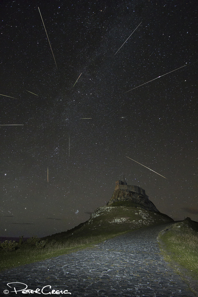 Метеорный поток Персииды-2013 над старинным замком на северо-востоке Англии. Эта композитная фотография получена Peter Greig в ночь на 12 августа 2013 года.