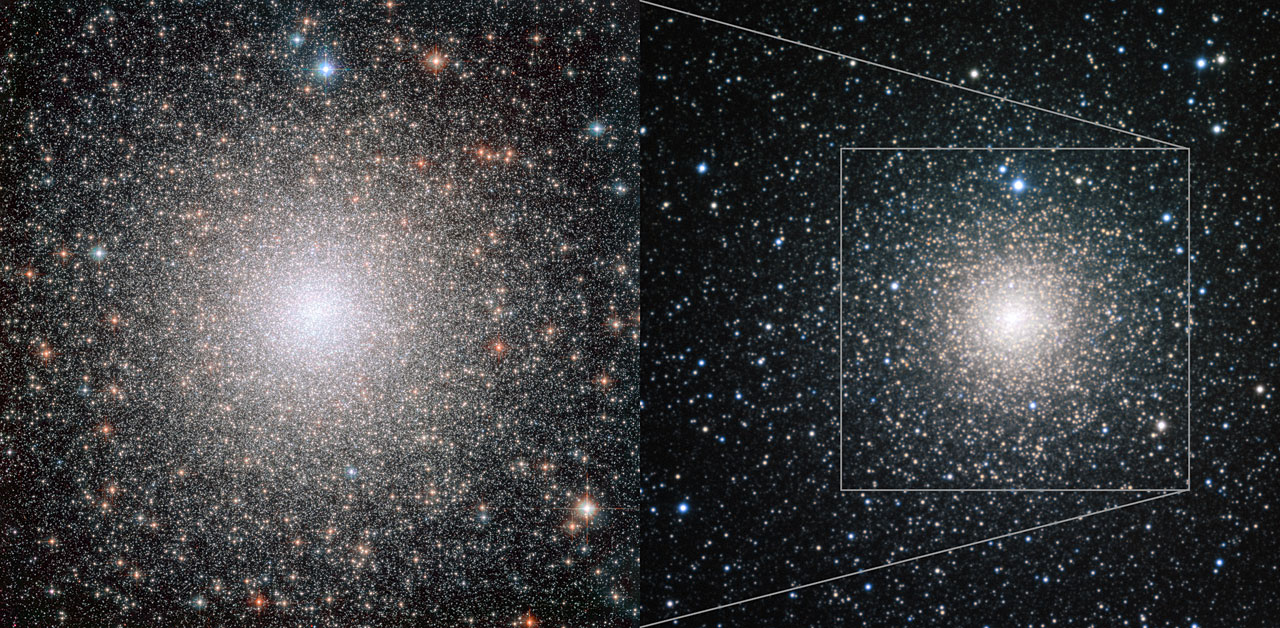 На этом снимке Вы можете сравнить изображение одного и того же объекта - шарового скопления NGC 6388, сделанные с земной орбиты и с поверхности Земли.