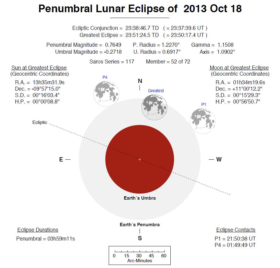В ночь с 18 на 19 октября 2013 года произойдет последнее в этом году лунное затмение, на этот раз полутеневое. Условия затмения благоприятны для наблюдения в Европе, Африке и большей части Азии.