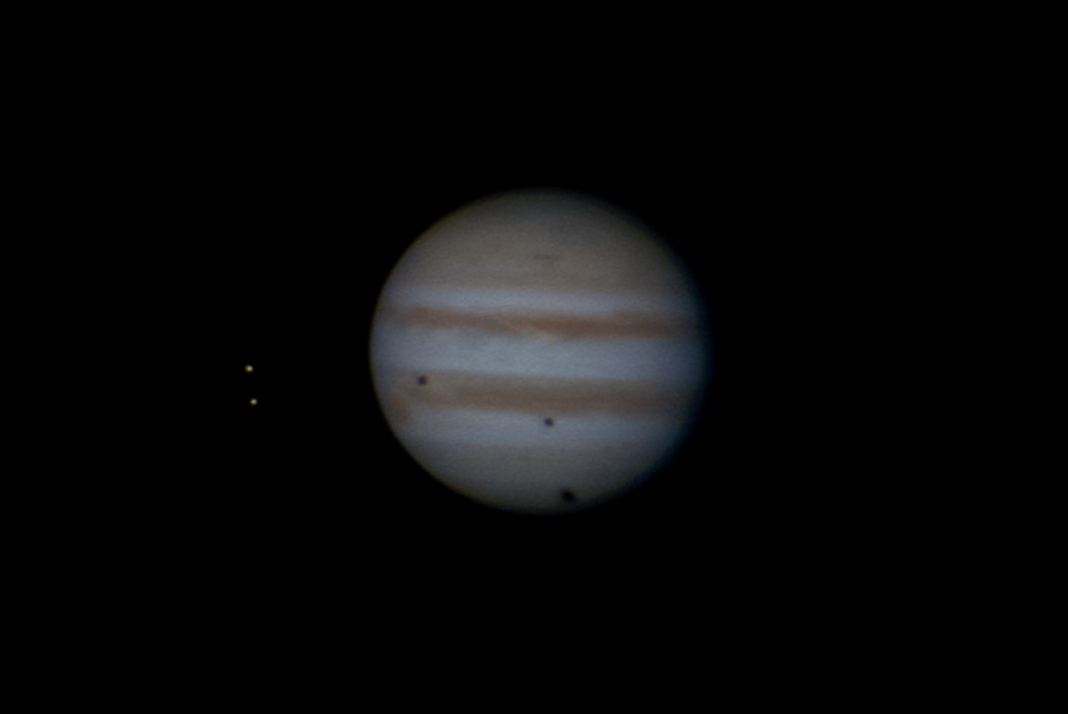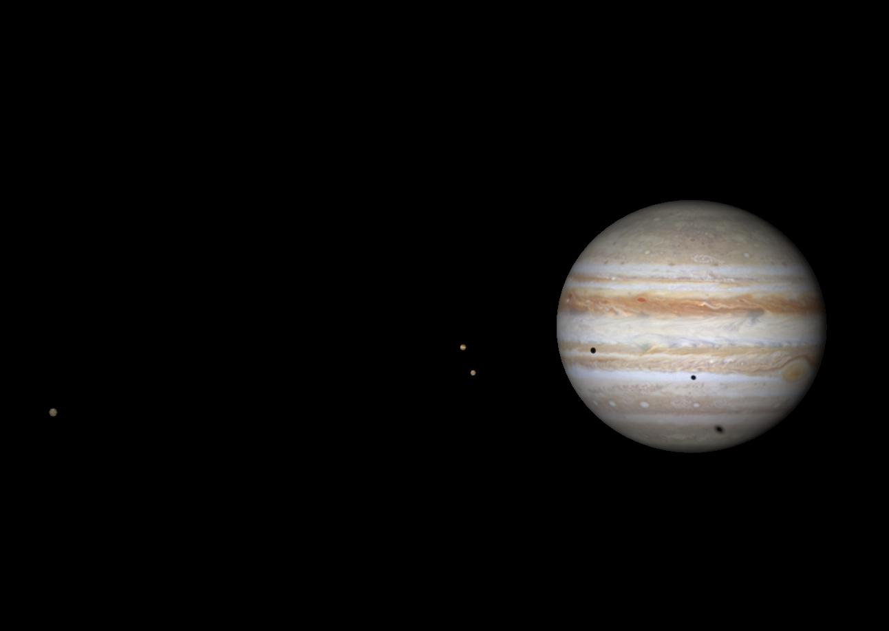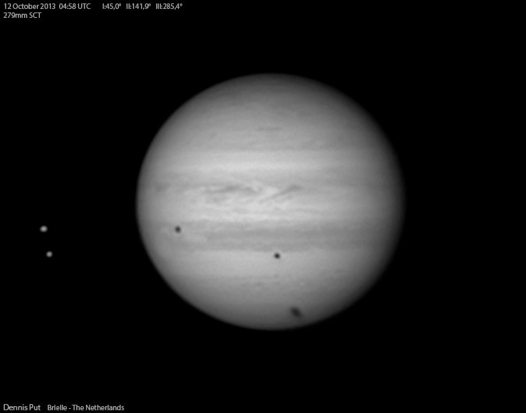 В ночь с 11 на 12 октября 2013 года произойдет довольно редкое астрономическое явление - тройное солнечное затмение на Юпитере. Три галлилеевых спутника одновременно отбросят свои тени на диск планеты-гиганта. Явление начнется в 4 часа 32 мин по Всемирному времени и продлится чуть более одного часа. На рисунке-симмуляторе мы можем видеть примерно середину этого явления: слева Каллисто, ближе к диску Юпитера Ио (выше) и Европа, на диске Юпитера тени Ио, Европы и Каллисто (слева на право). Явление будет наблюдаться в западном полушарии Земли.
