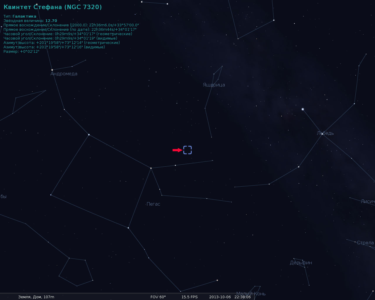 Это изображение составлено из различных астрофото полученных на орбитальном телескопе Хаббл и наземном телескопе Субару на вершине горы Мауна-Киа. Галактики квинтета находятся в центральной части фотографии, но на самом деле только четыре из пяти галактик являются взаимодействующими и сошлись в космическом танце из повторяющихся сближений. И всё это происходит в 300 миллионах световых лет от нас. Четыре взаимодействующие галактики (NGC7319, 7318A, 7318B и 7317) выглядят более жёлтыми. Они искажены петлями и хвостами, образованными гравитационными приливами. Пятая, "лишняя" галактика NGC 7320 находится ближе к нам, на расстоянии всего в 40 миллионов световых лет, и не участвует в гравитационных взаимодействиях. Ее не трудно отличить по правильной структуре и более голубому оттенку. Также в поле зрения попала ещё одна галактика, в левом верхнем углу снимка: это галактика NGC 7320C. Она тоже находится на расстоянии 300 миллионов световых лет от нас. Конечно, если учесть её, то группа снова приобретают статус квинтета. На звездном небе квинтет Стефана можно найти на фоне созвездия Пегаса.