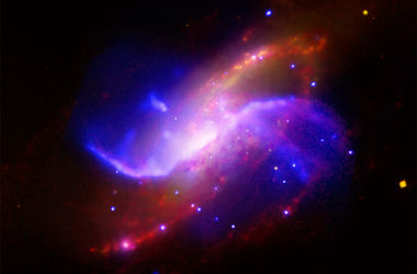 У галактики разглядели два дополнительных спиральных рукава Галактика NGC 4258 (Messier 106) в созвездии Гончие псы расположена на расстоянии в 23 млн световых лет от Млечного пути. В 60-х годах ХХ века у галактики разглядели два дополнительных спиральных рукава, видимых в радио- и рентгеновском диапазонах, в которых нет звезд. Американские исследователи проанализировали природу и влияние ударных волн от сверхмассивной черной дыры в центре этой галактики, сообщает naked-science.ru. В ходе исследования американских специалистов выяснилось, что сверхмассивная черная дыра в галактике NGC 4258 выбрасывает мощные струи, в которых находятся частицы высоких энергий. Они, ударяясь о диск галактики, производят ударные волны, которые, в свою очередь, нагревают состоящий из молекул водорода галактический газ до температур в тысячи градусов Цельсия. Судя по рентгеновским изображениям, в областях выше и ниже плоскости галактического диска находится множество огромных скоплений горячего газа, которые, как отмечают авторы исследования, сначала появились там, после чего уже ударными волнами были выброшены за пределы галактического диска. Согласно данным ученых, основная часть газа в течение 300 миллионов лет будет выброшена из диска галактики NGC 4258. Это, в свою очередь, замедлит процесс звездообразования в ней, которое в настоящее время в 10 раз медленнее, чем в Млечном Пути. Космический телескоп «Гершель», предназначенный для полномасштабного изучения инфракрасного излучения в космосе, оценил массу газа в галактике NGC 4258, которая может использоваться для образования звезд. Авторы исследования при помощи телескопов NASA получили совокупное изображение галактики, изучая в различных диапазонах электромагнитного спектра ударные волны и аномальные рукава. Если сравнить сверхмассивную черную дыру в центре NGC 4258 с аналогичным объектом в центре Млечного Пути, то последний окажется в 10 раз меньше. Кроме того, черная дыра в галактике NGC 4258 использует гораздо больше вещества. Таким образом, она одновременно замедляет процессы звездообразования и распыляет вещество в виде аномальных рукавов. Данное исследование поможет разобраться в том, какое воздействие на звездообразование и эволюцию галактик в целом может иметь природа черной дыры.
