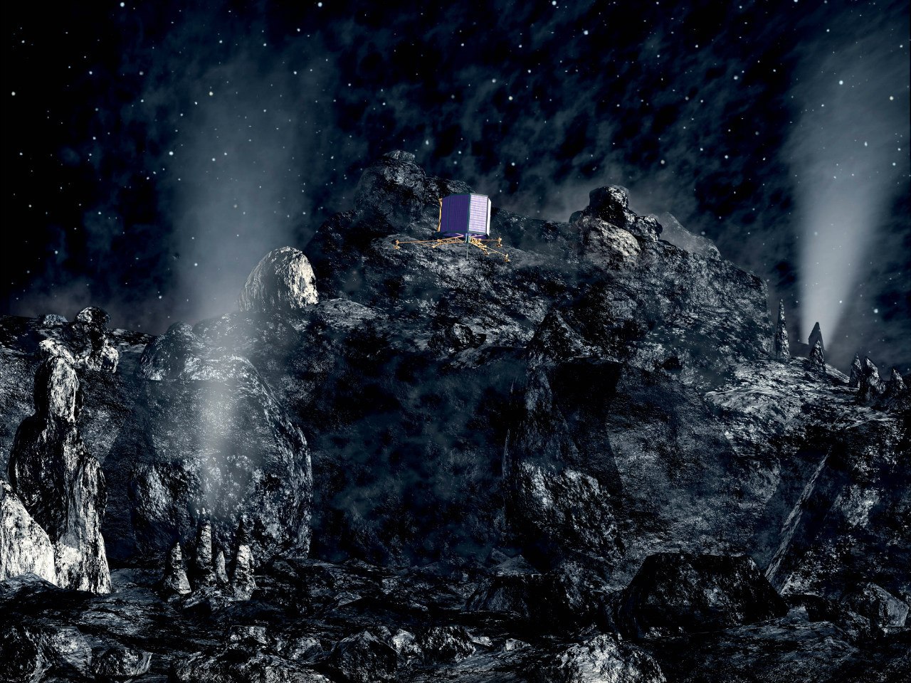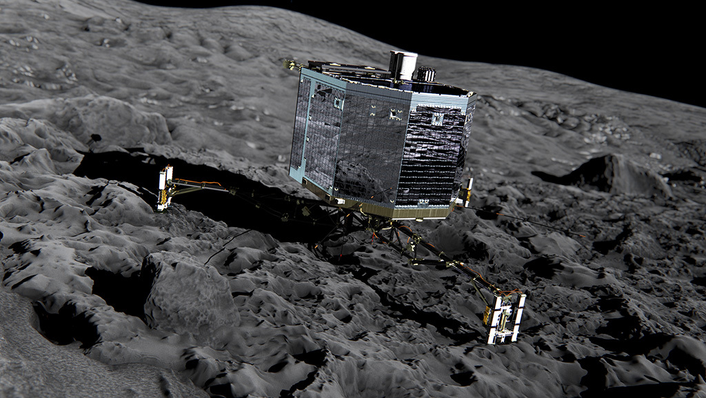 Так будет выглядеть спускаемый зонд «Фила» космического аппарата «Розетта» на поверхности кометы 67P/Чурюмова-Герасименко